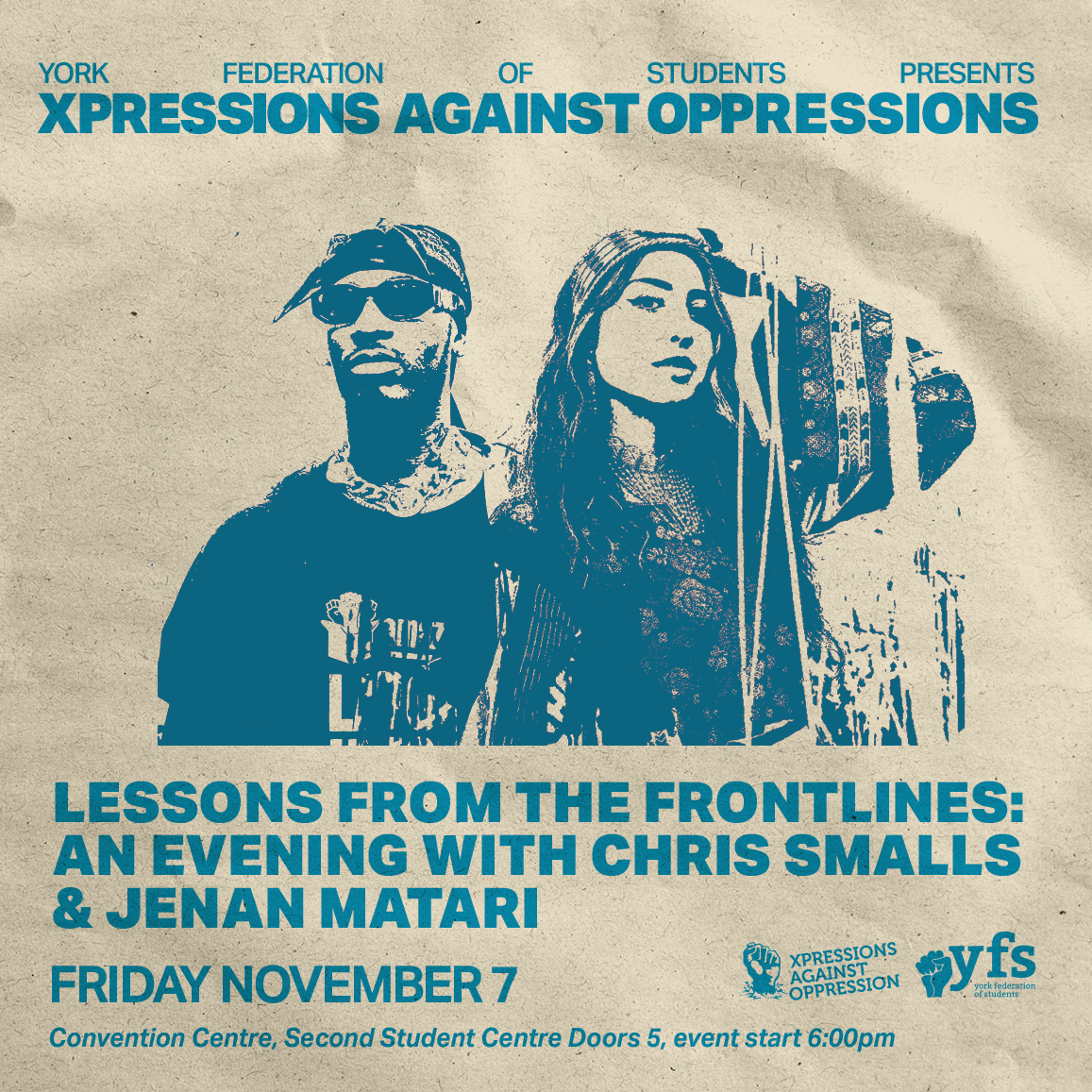 Lessons From the Frontlines will be taking place on Friday, November 7th in the Convention Centre, Second Student Centre. Doors will open at 5pm, with the event starting at 6pm.